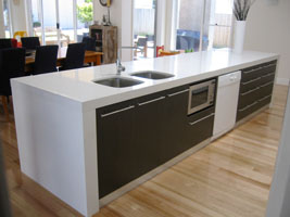 Material: Caesar Stone Snow Edge Profile: 100mm Mitered Skirts with Mitered End panels Accessories: 2 Polished Hole sinks Mitered skirts can be of any thickness required, […]